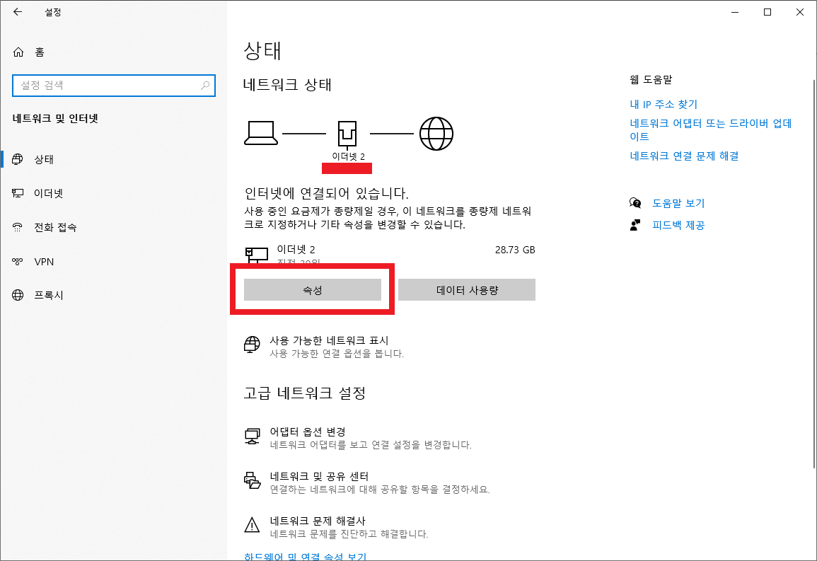 3. 네트워크 및 인터넷 창 -> 속성 클릭