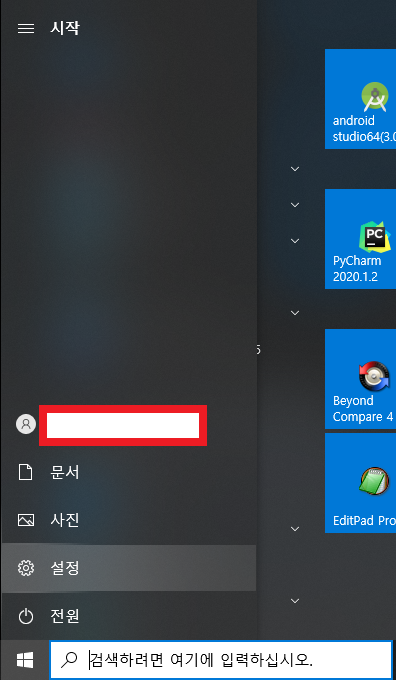 1. 윈도우 10 시작 메뉴 -> 설정 클릭
