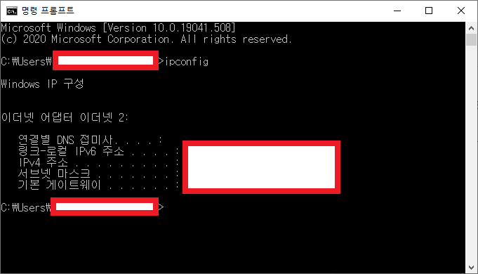 열린 명령 프롬프트 창에서 ipconfig를 입력하고 엔터를 칩니다.
