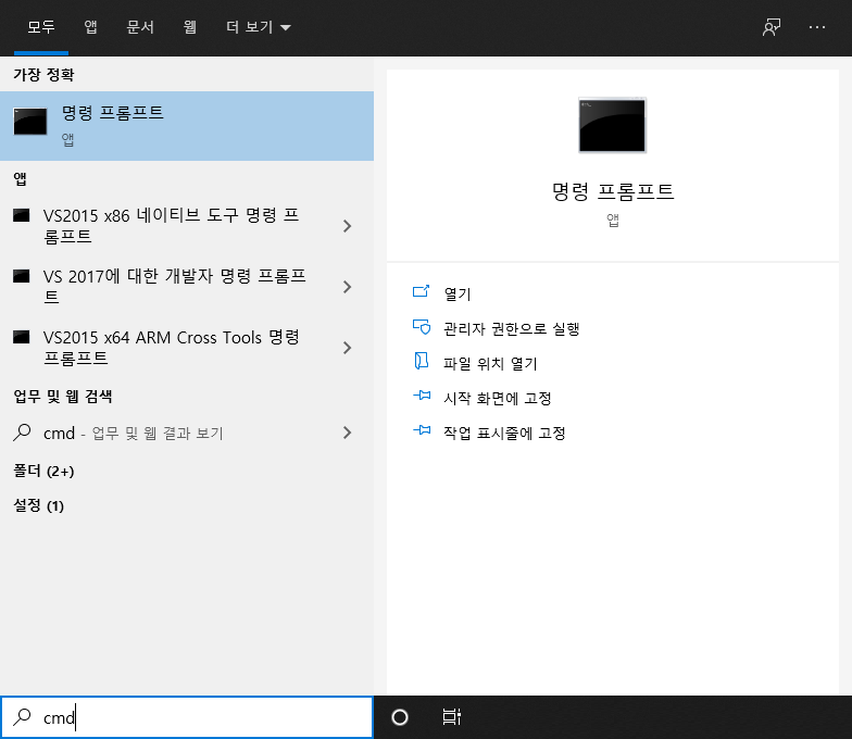 윈도우 시작 버튼 오른쪽에 있는 검색창에 cmd를 입력하면 나오는 명령 프롬프트 창을 엽니다.