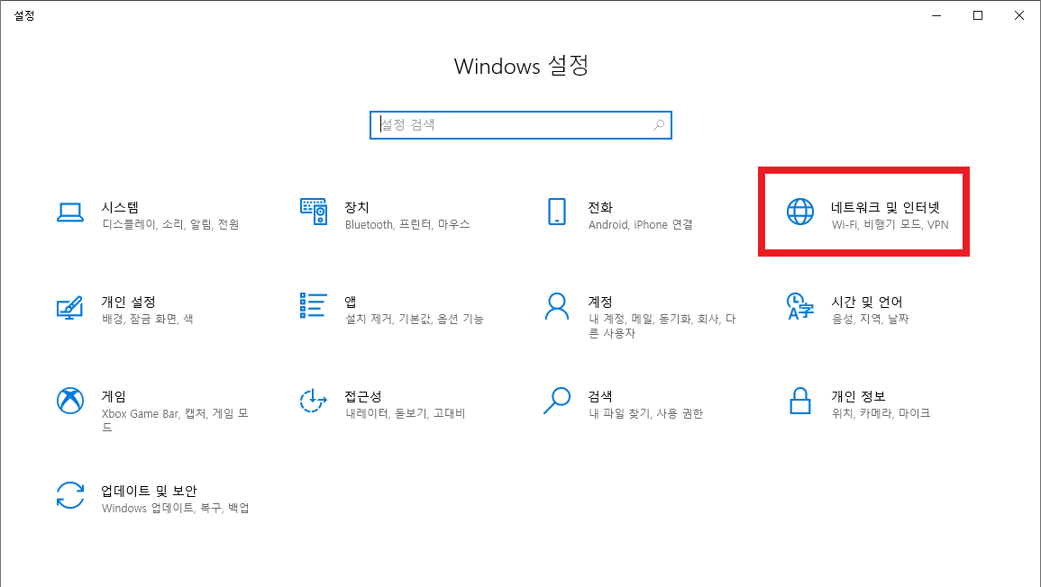 2. 설정 창 -> 네트워크 및 인터넷 클릭