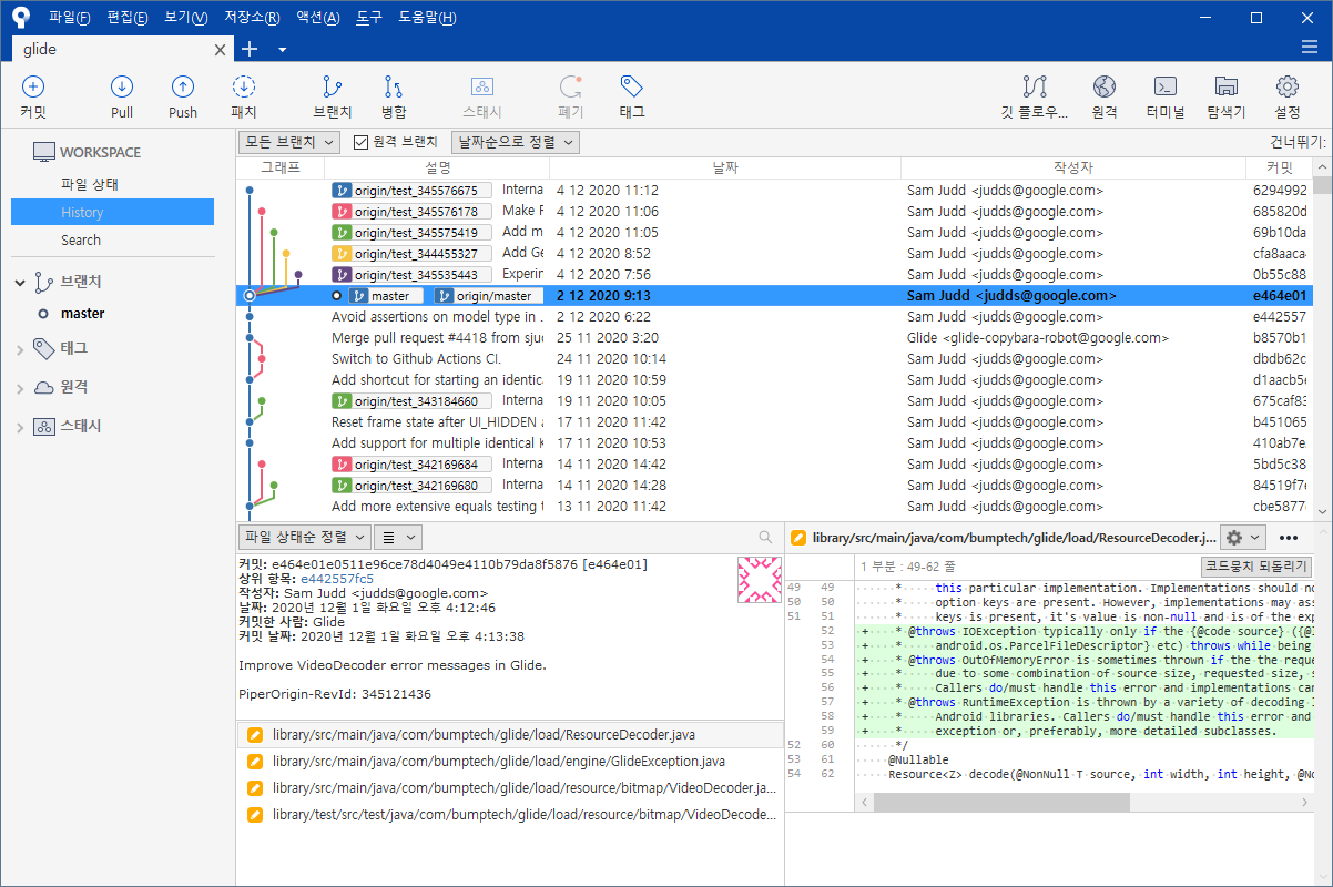 3-2. 그동안의 커밋 히스토리가 보입니다. 용도에 따라 브랜치를 여러 개 만들어서 소스를 관리하는 git의 모습을 볼 수 있습니다.