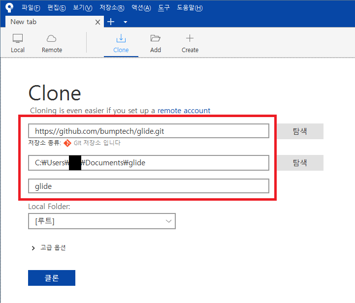 그리고 저장소를 저장할 로컬 위치와 이름을 적어 넣습니다. 그리고 클론 버튼 클릭.