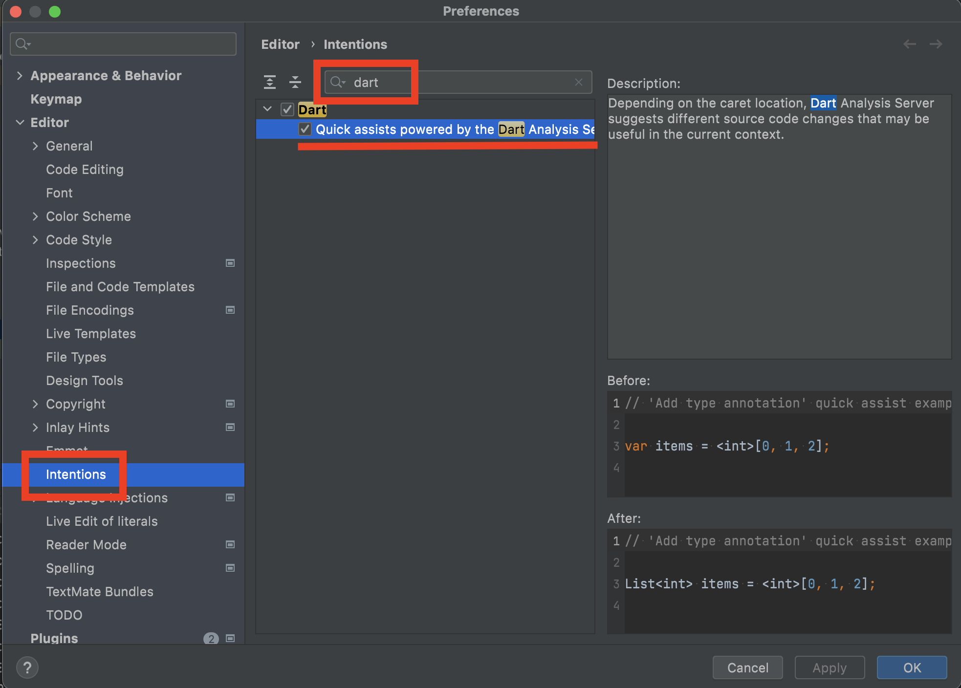 2. Intentions 탭 -> dart 검색 -> Quick assists powered... 메뉴 체크