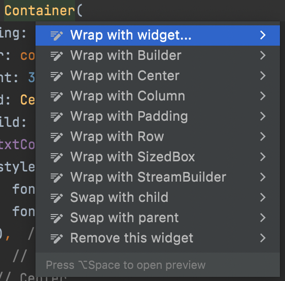 Flutter로 개발하면서 Widget을 다른 Widget으로 감싸거나 제거할 때 단축키가 있습니다.