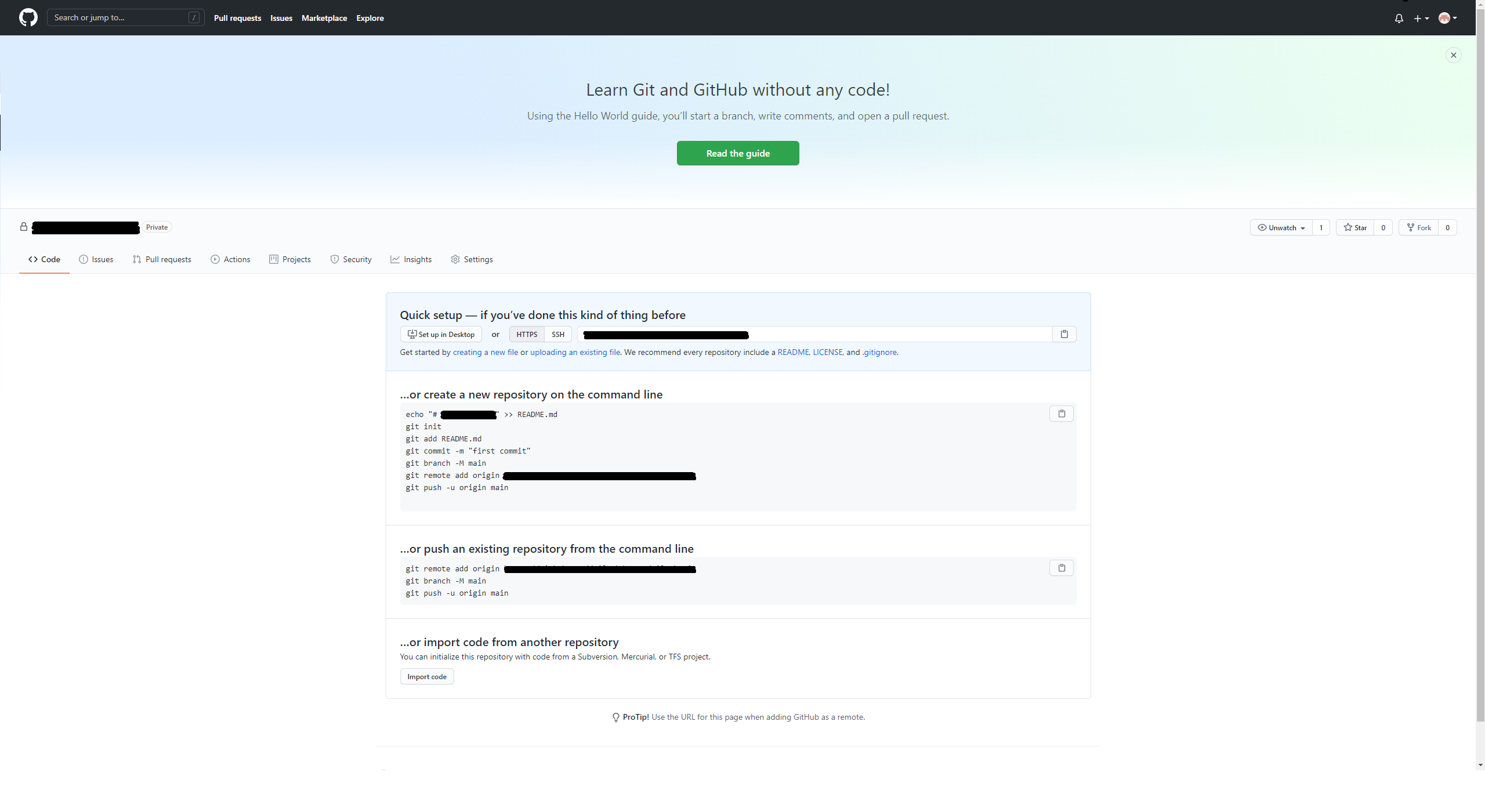 Public / Private : 원격저장소의 공개 여부를 정합니다. Public은 다른 사람들이 모두 볼 수 있습니다. Private는 지정한 사람만 볼 수 있습니다.