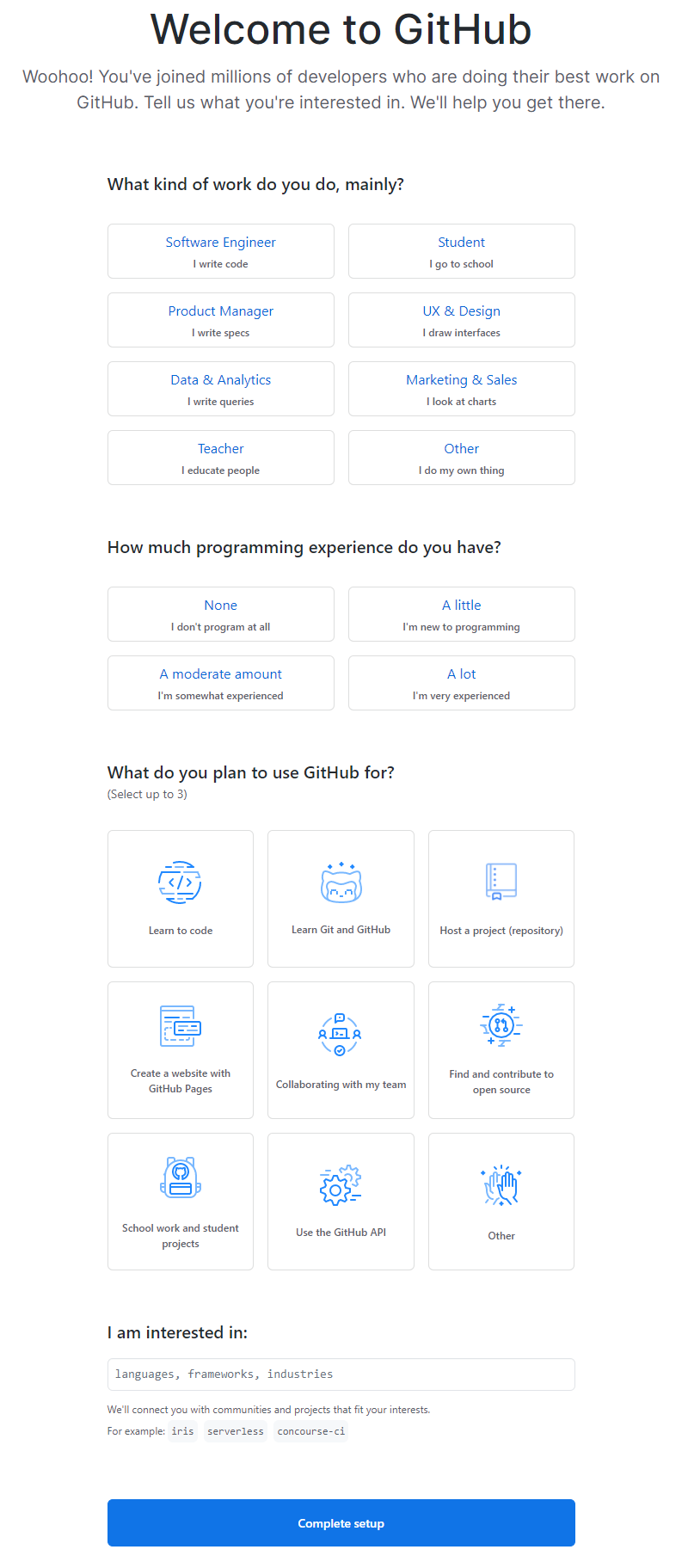 직업, 개발 경력, 깃허브 사용 계획, 흥미 등을 물어봅니다.
