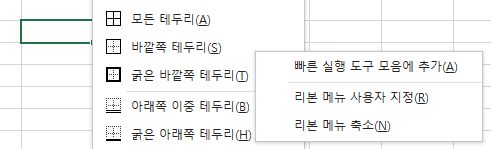 엑셀을 쓰다 보면 같은 기능을 반복적으로 사용할 때가 생깁니다. 셀의 배경색을 같은 색으로 칠한다던지, 테두리를 적용한다던지, 글자 가운데 정렬 등 생각보다 많은 기능을 반복적으로 사용합니다. 또 업무 특성상 자주 쓰는 기능들도 있겠죠? 역시 마우스로 반복적인 작업을 하는 것보다 단축키를 이용해서 사용하는 게 훨씬 빠르고 효율적이기 때문에 이러한 자주 쓰는 기능들을 빠른 실행 도구 모음이라는 곳에 추가시키고 단축키로 해당 기능들을 사용하는 방법을 알아보겠습니다. 빠른 실행 도구 모음 추가 및 제거 빠른 실행 도구 모음에 추가하는 방법은 간단합니다. 추가하고자 하는 기능을 마우스 오른쪽 클릭하면 아래 그림처럼 빠른 실행 도구 모음에 추가 메뉴가 보입니다. 저는 바깥쪽 테두리 기능을 추가해 보겠습니다. 추가..